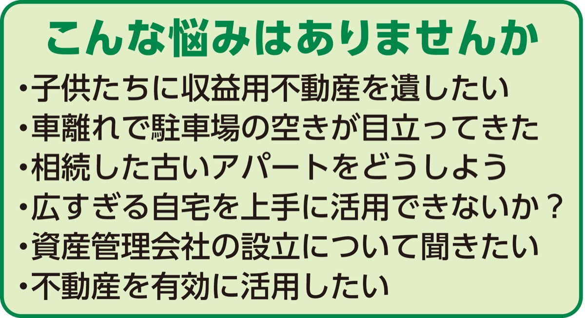 古いアパートは「空室や災害のリスク」、空き地・空き家は放置していると土地が荒れ「資産価値が下がる」など、様々な問題が発生する場合があるという。しかし、誰に相談したら良いのか分からず「修繕や維持管理費、税金が高い」「相続対策、何から手をつけたら」「子どもに負担をかけず不動産の管理を任せたい」など悩んでいる人も多いそう。