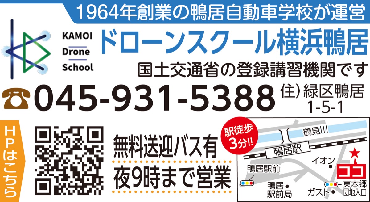 ドローンの国家資格が取得できる学校「ドローンスクール横浜鴨居」が、このほど緑区鴨居に開校した(場所:鴨居自動車学校施設内)。同スクールでは現在、無料体験会を開催中。ドローンの操縦を体験できるほか、資格制度や活用方法などの説明も受けられる。少人数制で気軽に質問しやすい環境。ドローンの可能性に関心がある人は参加してみては。