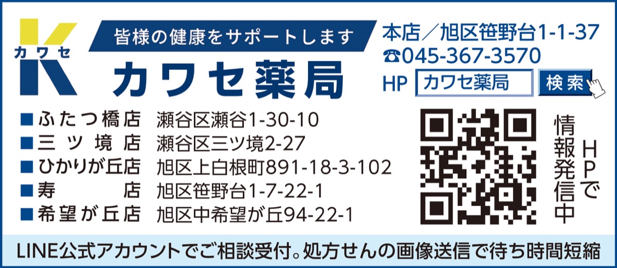 カワセ薬局は現在、旭区と瀬谷区で6店舗を構えている。シニア層の人たちが加齢による心身の活力低下を防ぎ、健康寿命を延ばすために、「特に運動と食事を大切にして欲しい」と呼びかけ。管理栄養士が常駐している店舗もあり、年齢や健康状態に合わせた栄養指導を行っている点が大きな特徴だ。「処方箋が無くても、栄養相談や健康相談で気軽に利用してください」と話している。