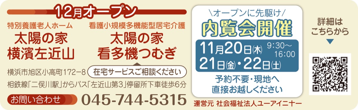 高齢化が進む昨今、ケアの在り方は各家庭が直面するテーマといえる。横浜市旭区小高町(旧小高小学校)に、12月1日(月)に開設される社会福祉法人ユーアイ二十一が運営する特別養護老人ホーム「太陽の家横濱左近山」。先駆けて11月20日(木)・21日(金)・22日(土)に内覧会を開催する。詳細は下記画像を参照。