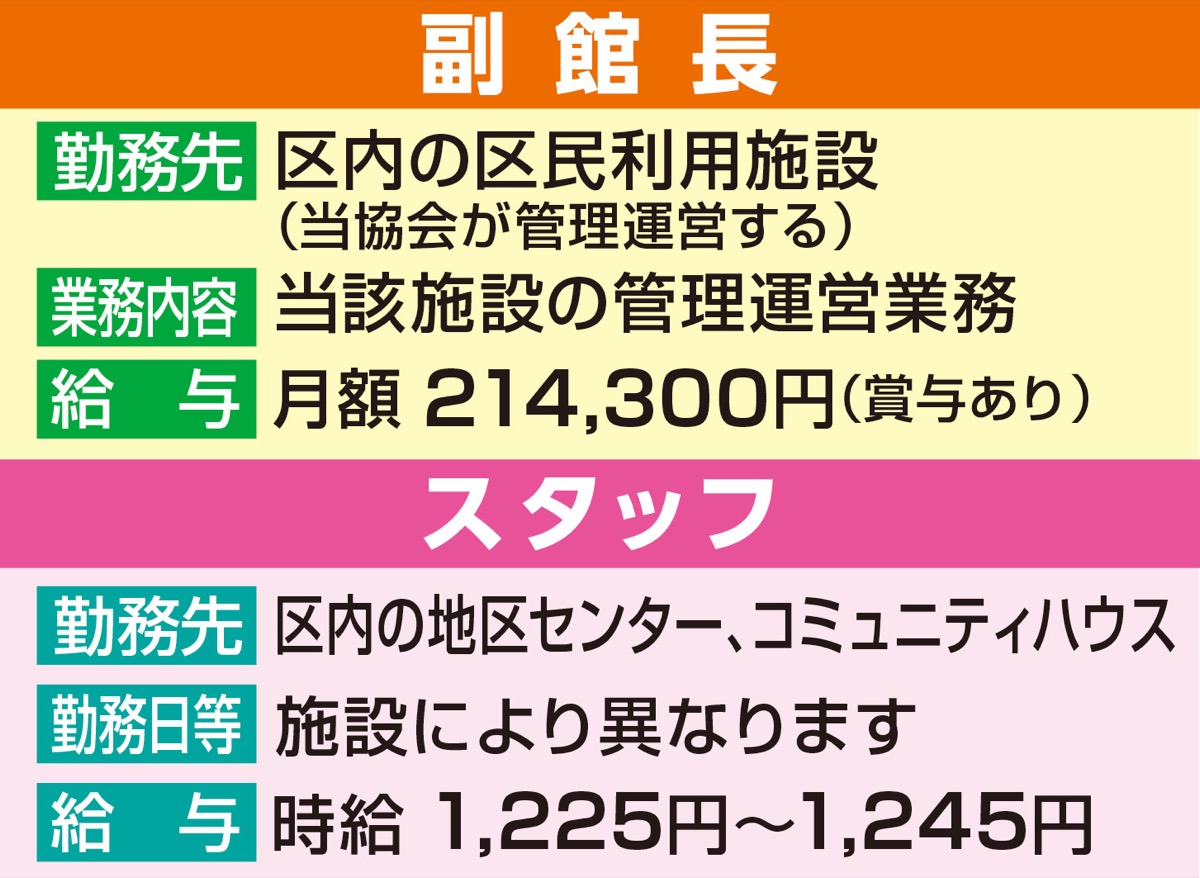 旭区内で地区センターなど11の公共施設を管理運営する一般社団法人あさひ区民利用施設協会では、副館長およびスタッフを募集している。
