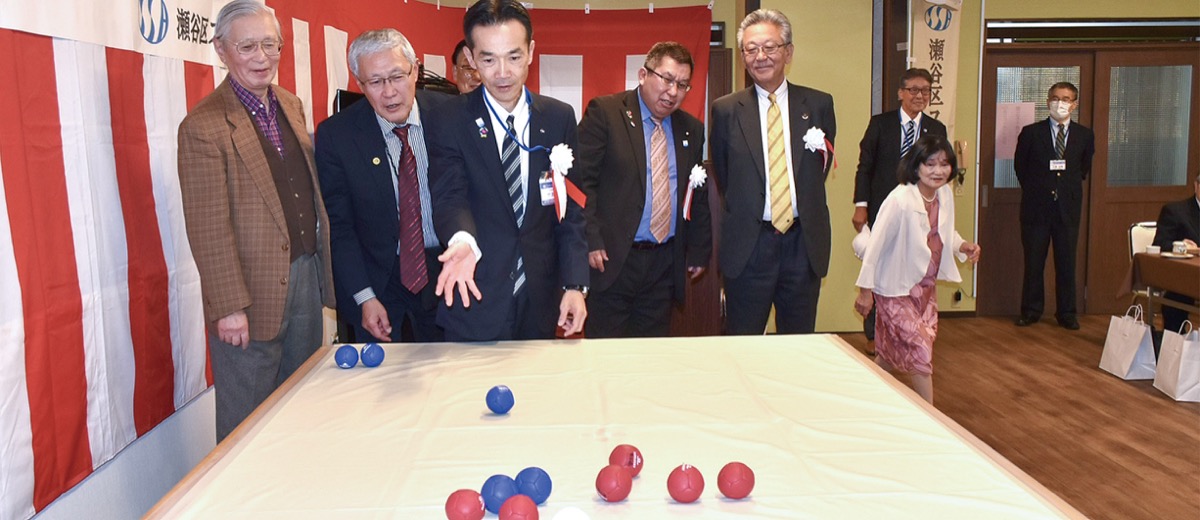 祝宴では、これまでの活動を振り返るスライドショーを見ながら歓談。アトラクションは、机の上でできるテーブルボッチャで、チームに分かれ3対3の試合を行った。白熱した戦いに会場は大いに盛り上がった。