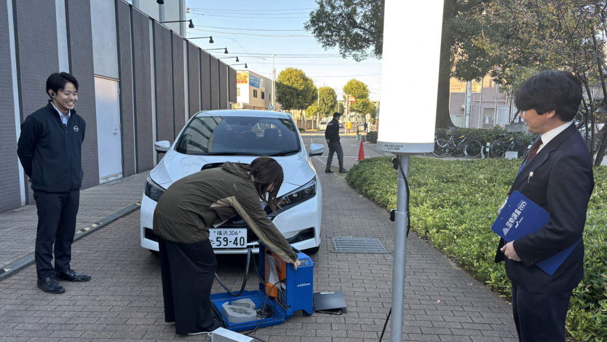 この訓練は、災害時に職員が円滑に活動できるよう、技術習得の場として設けられているもの。今回は災害時などの電源喪失に備え、電気自動車から電気を取り出す給電操作方法を学び、緊急時の迅速な対応を目的とし、実施された。