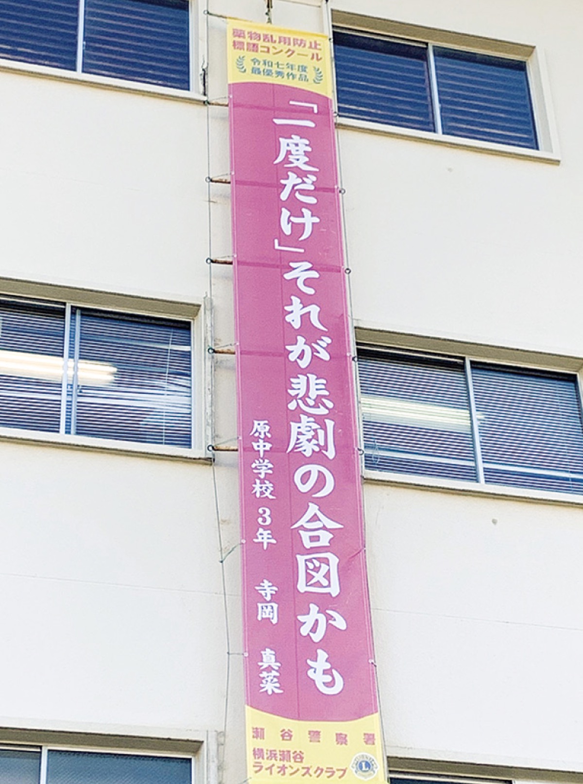 昨年12月には、同LCから瀬谷警察署(木暮勝署長)に最優秀作品の垂れ幕が寄贈された=写真=。木暮署長は「区内の中学生に薬物乱用について考える機会をつくってもらい大変嬉しい」と話した。同署は若者の大麻の乱用が激増しているといい、「誘われてもきっぱりと断る。できない場合はその場を離れること」と注意を促した。
