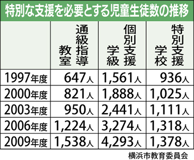 特別支援学校では、教室不足や狭あい化が深刻だ。本郷特別支援学校(栄区)と港南台ひの特別支援学校(港南区)では、09年度の知的障害児童・生徒数が施設規模に対して約1・2倍だったほか、4倍近い児童・生徒が通っている県立養護学校も。市内の県立養護学校の教諭は「特に高等部で生徒の増加が目立つ」といい、市では「これまで個別支援学級や普通学級にいた生徒も、高校ではより専門的な教育を求めている」と話す。