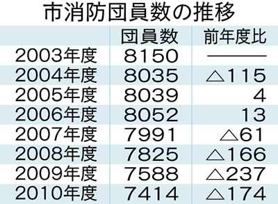 これらの市消防団ではほぼ毎年、団員の減少が続いている。2003年度に8150人だった団員数は、翌04年度には8035人と大きく減り、05年度も改善が見られなかった。
