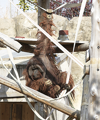 ズーラシアをはじめとした各地の動物園では、オランウータンの樹上行動を充実させようと耐久性のある消防ホースを活用してハンモックを設置。この技術が注目され、生息地同士をつなげる橋をかける活動につながった。