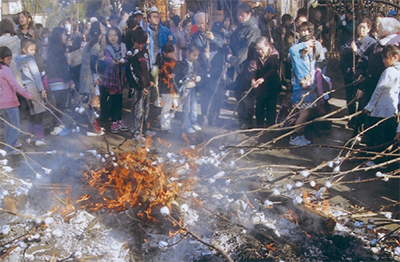 参加者は、燃やした火で繭玉を焼いたり、振る舞われた豚汁を食べるなどして、毎年恒例の冬の風物詩を楽しんだ。