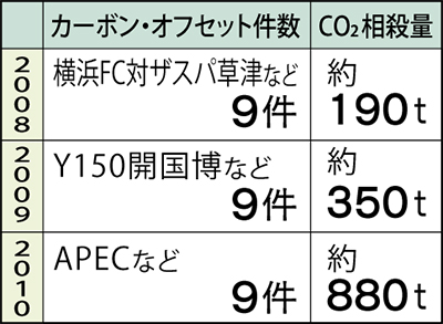 横浜市では2008年度から導入しており、市や市内民間企業が実施したオフセットは、市が把握するところでは08年から昨年まで各年9件。件数は変わらないものの、相殺されたCO2は約190t、約350t、約880tと年ごとに倍増している。880tは、07年度における市民155人分の同ガス排出量に相当する。倍増の要因には、比較的大規模なオフセットの実施が挙げられる。09年には、神奈川新聞社など14社が横浜ベイブリッジの景観照明で発生するCO2に対して実施し、約200tが相殺された。また昨年には、APEC首脳会議の会場となったパシフィコ横浜(西区)やその周辺で排出されたCO2に対して、市が販売する飲料水「はまっ子どうし」の売り上げ金の一部をクレジット購入に充てるなどして約715tが相殺された。