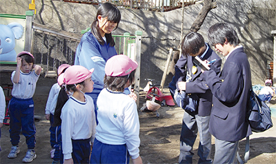 教室で、子どもたちと折り紙で雪うさぎをつくったり、園庭で鬼ごっこをしたりなど園児の世話を体験した。園児と鬼ごっこをしていた古木海帆さんは「鬼ごっこは小学生以来なので懐かしい」と感想を話した。