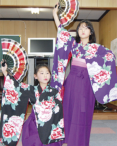 瀬谷区阿久和南の中村自治会館で毎週舞踊の稽古に励む、中原優さん(原小5年)と森覇佳(はるか)さん(原小2年)。2人は歌謡舞踊の教室「西宝会」に3歳から参加し、「チビ玉」として発表会や敬老会、地域の祭りなどに出演する。2人の踊りを楽しみに来場する人も多いという人気の踊り手だ。