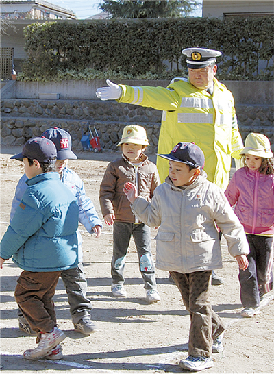 この教室は、小学校への入学を前に、道路の正しい歩き方を身につけてもらおうと開催。瀬谷署の職員や、交通安全関係のボランティア団体の指導のもと、横断歩道の渡り方などを学んだ。園児は小さな手をいっぱいに広げ、「右、左、右」の安全を確認しながら元気に園庭を歩いた。
