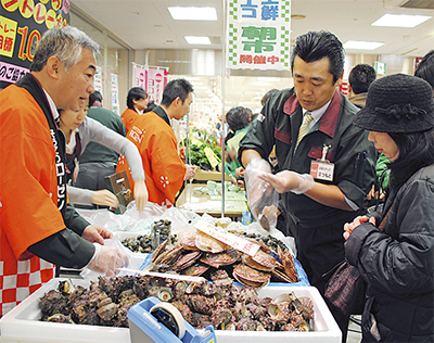 当日は朝市が始まる午前10時を待たずに売り場に人だかりができる盛況ぶり。お買い得価格の野菜や魚介類を求める人で賑わった。