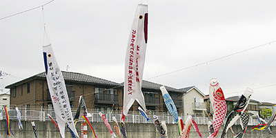これは毎年恒例の行事で、例年焼きそばの振る舞いなども行われていたが、今年は東日本大震災を受け自粛。代わりに大小様々なこいのぼりの中には「がんばれ東北」、「東日本がんばれ、夢と希望を」など被災者に向けた震災復興を願ったメッセージ入りのこいのぼりも揚げられた。