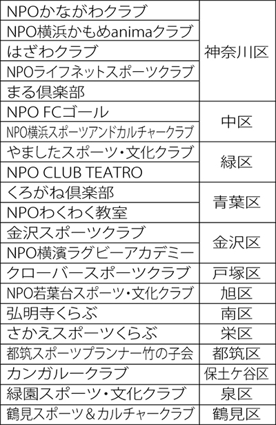 文部科学省が昨年発表した「スポーツ立国戦略」では、多世代が多種目を楽しむことができる「総合型地域スポーツクラブ」を主軸の一つとしている。横浜市は13区、21カ所に総合型クラブを設置(=表)。NPO法人などが市や市体育協会と連携しながら運営する。