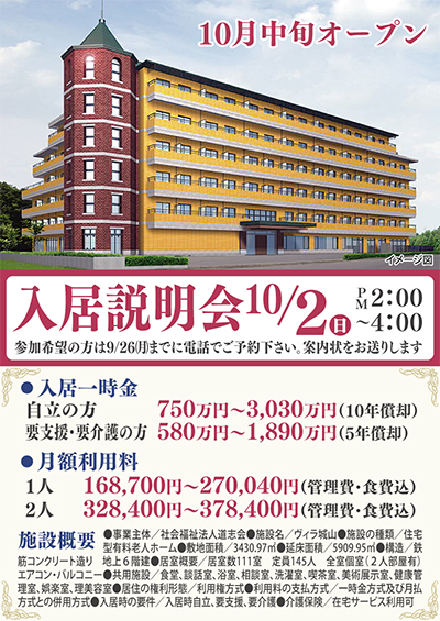 春には「かながわの花の名所100選」にも選ばれている桜の名所、城山公園に隣接し、文教施設や総合病院、大型ショッピングセンターも近接するなど、住環境設備が充実しているホームは10月中旬にオープンする。詳しいお問合せは左記まで。