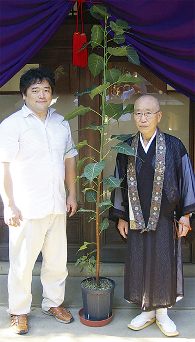 瀬谷区相沢の「健康畳植田」の植田昇社長が9月12日、最勝寺(二ツ橋町・栁澤栁丸住職)にインド菩提樹を寄贈した。これは、木の根元で釈迦が悟りを開いたとされるインド菩提樹の子孫で、植田さんが知人を通して手に入れたもの。