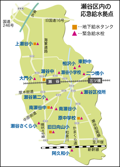 災害時の応急給水拠点は横浜市内で515カ所あり、地下給水タンクが134カ所、緊急給水栓が358カ所、配水池が23カ所。同局によると全て合わせると全市民の10日分の量に相当するという。瀬谷区内には地下給水タンクを5カ所、緊急給水栓を14カ所設置。おおむねタンクと配水池は半径約1Kmごと、給水栓を合わせると半径約500mごとに配置できるよう整備されている。配水池は区内にないが、近隣には川井配水池(旭区)や高塚配水池(泉区)などがある。