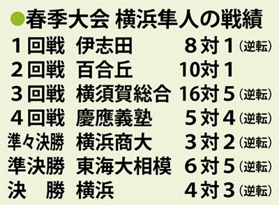 3年前の同校といえば、「スーパースター不在」といわれながらも「攻め続ける」野球で強豪校との接戦を次々と制し、県内189校の頂点に立ったのは記憶に新しいところ。今回の春季大会も逆転に次ぐ逆転で、7試合中6試合が逆転勝ち。4回戦では延長13回の死闘を制し、慶應義塾にサヨナラ勝ち。ここで勢いに乗ると、準々決勝で横浜商大、準決勝で東海大相模と強豪校を逆転で下し、決勝では4期連続の甲子園出場を目指す横浜を、またも逆転で退けるという強さを見せた。