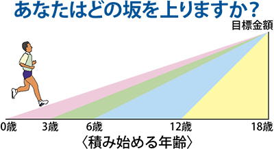 保険のプロである保険診療所三ツ境店が強調しているのが、まさにこのこと。学資保険はゴールが決まっているので、貯め始めるのが遅くなれば遅くなる分、月の負担は増えていく。左上の表でいえば、ランナーはスタートが遅くなればなるほど急な坂道を登らなければならないのだ。