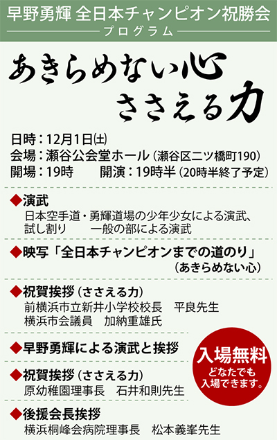 9月に川崎市体育館で開催されたJIKA日本国際空手協会主催「第7回全日本クラス別空手道選手権大会」。各流派が集う日本最大級の大会で、三ツ境在住の早野勇輝さん(23)が見事軽量級のチャンピオンに輝いた。早野さんの優勝を祝し、後援会や関係者らによる「全日本チャンピオン祝勝会」が12月1日(土)、瀬谷公会堂で開かれる。開場19時(開演19時半)。