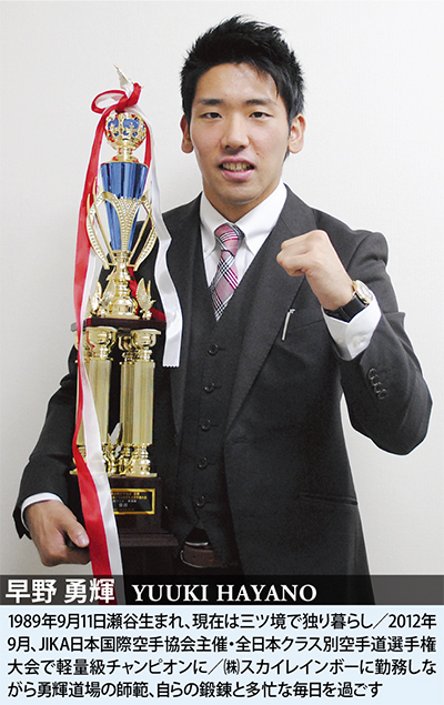 早野さんが空手を始めたのは8歳の頃。全日本王者に着くまでの15年間、山あり谷ありの年月だった。極真会館に入門後間もなく才能を発揮。県大会や全国大会にも出場、このまま順調に進むように思えたが、17歳の時、腰を疲労骨折。スポーツ選手として窮地に立たされた。その後、辛く厳しいリハビリを、家族や周囲の支えで乗り越え、19歳の時にはK―1デビューも果たす。20歳で独立、勇輝道場を開いた。師範として指導をしながらも、選手としての心残りが拭えず、今年3年振りに現役に復帰。復帰後すぐの同大会で全日本王者に輝いた。今後も道場での指導を続けながら、選手としても積極的に大会に出場するという。
