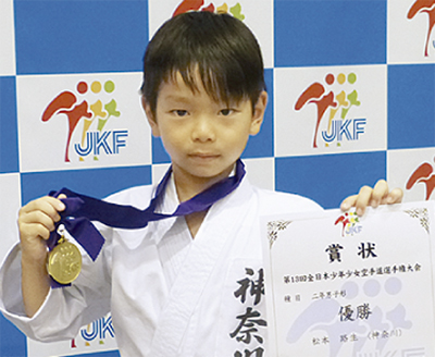 松本君は日本空手道黎明会瀬谷支部(水谷暢孝師範)に所属。道場に通う2人の兄に憧れ3歳で空手を始めた。年長で県大会優勝、昨年実施された同大会では3位の成績だった。念願の金メダルを手にした松本君は「去年3位だったので、もっと練習すれば優勝できるんだと思い、今年はいっぱい練習をしました。優勝できて嬉しい」と喜びのコメント。指導にあたった水谷さんは「家族一丸となって勝ち取った優勝」と語った。