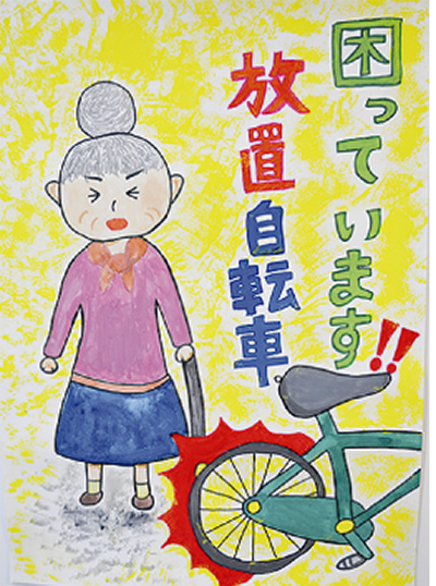 瀬谷区長賞には三ツ境小学校5年の鈴木世理奈さんが選ばれた。「駅の近くに放置自転車が多く、お年寄りが困っている姿を見た」と話した鈴木さんの作品は、放置自転車にお婆さんがぶつかり困っている様子を描いたもの。瀬谷警察署の増田署長は「区内は狭い道が多く、自転車事故が多い。ポスターに描いただけでなくマナーを守ってもらえれば」と受賞者たちに注意を呼びかけた。
