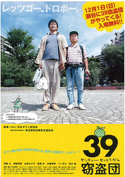 瀬谷区知的障害理解啓発グループ「ant mama」の主催で12月1日(日)、ダウン症の青年が演じる映画「39窃盗団」が上映される。障害者を取り巻く現実をコメディータッチに描いた作品。場所は瀬谷公会堂で午後1時上映(正午開場)。入場無料で、先着300人。押田興将監督=人物風土記で紹介=は南台出身。上映後にはトークショーもあり、主演を務めた監督の実弟の清剛(きよたか)氏と大(ひろし)氏も登壇する。押田監督は「生きることにためらわず行動する姿を見てもらえれば」と話した。