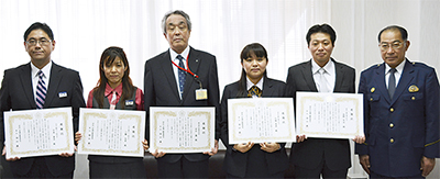 瀬谷警察署(増田勝署長)で11月7日、振り込め詐欺の被害を未然に防止したとして、区内3つの郵便局と銀行に感謝状が贈呈された。功労者は、(写真左から)みずほ銀行三ツ境支店・日高章彦さん、工藤友里さん、横浜瀬谷南郵便局・田中優さん、齋藤容子さん(欠席)、神奈川銀行瀬谷支店・大塚友美さん、長野年宏さんの6人。