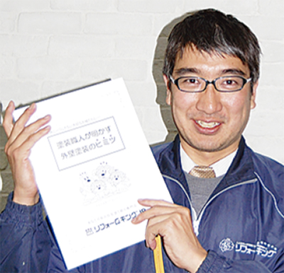 リフォームキングは、地域密着の塗替え専門店。外壁塗装を考えている人には、相見積りの際に参考になる冊子『外壁塗装のヒミツ』を進呈しているので、問合せてみたという。「担当の大町さんにお会いして、業者の比較ポイントまで教えていただきました。相見積りをとって検討し、最終的には対応の良さもあって大町さんにお願いしたんです」と笑顔。その時に教わった7ポイントが左表。冊子にはより詳しい情報が掲載されている。