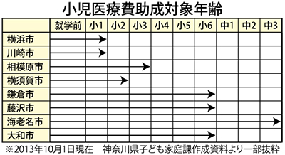 たとえば、厚木市や海老名市は中学3年、平塚市や鎌倉市は小学6年と設定しているのに対し、開成町や湯河原町は就学前まで。一方、横浜市では12年10月に現行の小学1年までと拡大したが、それでも県下では川崎市と並んで下位の水準となっている。