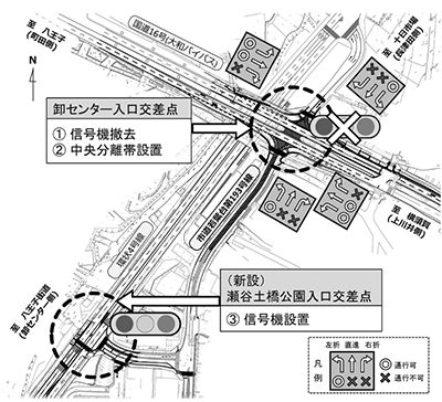 卸センター入口の信号撤去に伴い、新たに市道と環状4号線を繋ぐ道を開通。国道16号線の上川井方面から、市道193号線、長津田方面へ向かう道を確保した。瀬谷土橋公園入口交差点には横断歩道と信号機を新たに設置し、16日午後1時頃の開通を目指す。