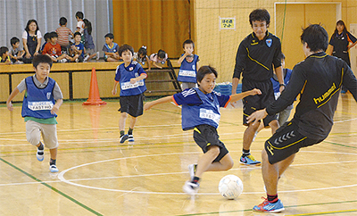 上瀬谷小学校体育館で9月11日、2014年度「横浜FCと遊ぼう」が行われ、横浜FCコーチ陣と子どもたちが交流した。