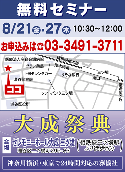 神奈川・東京で創業87年の実績とノウハウをもつ葬儀社「大成祭典」は8月21日(金)・27日(木)、「セレモニーホール大成 三ツ境」で家族葬、一日葬、直葬に関する無料セミナーを開催する。