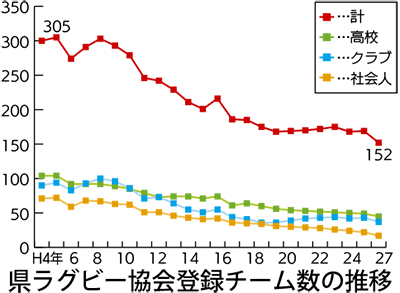 1980年代は、大学選手権の試合で国立競技場が満員になるほど人気だったラグビー。だが、近年は決勝戦でも観客数が1万人台に留まることもある。国内のチーム数もピーク時から35%減の3千超、神奈川県内ではさらに減少率が高く、今年半数を切った=図。