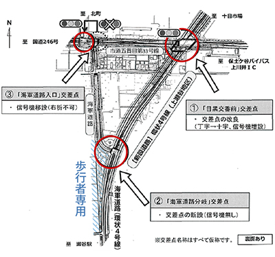 整備箇所は次の3カ所(交差点名はすべて仮称)。一つ目は「目黒交番前」交差点で、従来の丁字路から十字路に改良し、信号機を増設した。2つ目は海軍道路との分岐点。ここには新たに交差点(信号機なし)を設置した。3つ目は「海軍道路入口」交差点で、信号機の移設を行った。これによって、海軍道路から八王子街道に出る際の右折が不可となる。