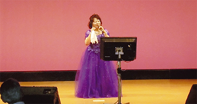 当日は午前と午後の部に分かれ、会員らが自慢の歌声を披露。ドレスなど鮮やかな衣装に身を包み、日頃の練習の成果を発揮していた=写真。審査・集計後、第3部で表彰式を行い、上位入賞者が発表されると観客席から歓声と大きな拍手が。舞台上の出演者に花束が渡される場面もあり、盛り上がった。