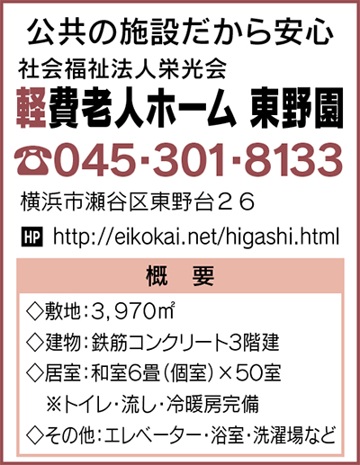 「安心・安全・やすらぎ」がモットーの『軽費老人ホーム東野園』。「軽費老人ホーム」とは、横浜市の補助金で運営している施設。60歳以上で、身体機能の低下等により日常生活に不安があると認められた人や、一人暮らしなどで老後が不安な人が利用できる。
