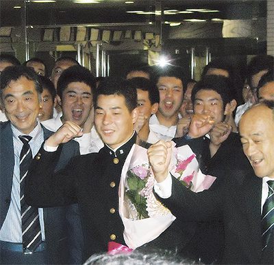 同校で、会議の様子を見守っていた大江選手。巨人の6位指名が発表されると、チームメイトや学校関係者は歓喜に包まれた。仲間に胴上げされてから臨んだ記者会見では「活躍できるよう切磋琢磨していきたい」などと抱負を語った。