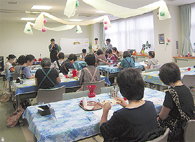 「アロハ」と名付けたのにも意味が。若い世代から年配の人まで「ハワイ好きな人が本当に多くて」と日頃、同ケアプラザで働くスタッフは話す。穏やかで温かいイメージがあり、世代問わず共通の話題に上がることの多いハワイをカフェのイメージに決め、名前を元気に呼びかける「アロハ」にした。フロアも南国の雰囲気たっぷりに仕上げ、フラダンス披露など、イベントの企画もしている。