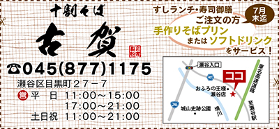 「十割そば 古賀」では、国産そば粉100%にこだわり、毎日店内の石臼でじっくりと挽いた「挽きたて・打ちたて・ゆでたて」の”三たて”そばが楽しめる。