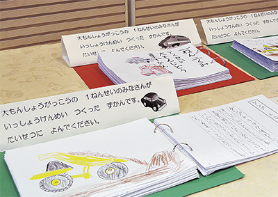 並べられた4冊の「特製自動車図鑑」は、同校1年生が国語の授業で作成したもの。自動車の説明文を通して文章の構成を学ぶ単元で、図鑑作りに挑戦した。