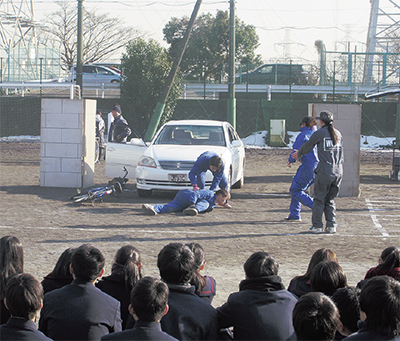 交通事故の怖さを目の当たりにして、ルールやマナーを守ることの大切さを学ぶスケアードストレート式の交通安全教室が1月29日、横浜隼人高校のグラウンドで開催され、1年生や学校関係者などおよそ740人が参加した。