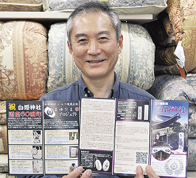 蚕の神を祭神とする「白姫神社」(三ツ境)の奉賛会と三ツ境商店街がこのほど、オリジナルのパンフレットを完成させた。遷座60年という神社の歴史や年中行事に加えて、蚕のまゆ玉にちなんで各商店が開発した商品を掲載。神社と商店街が協力しながら、地域活性化を目指す。