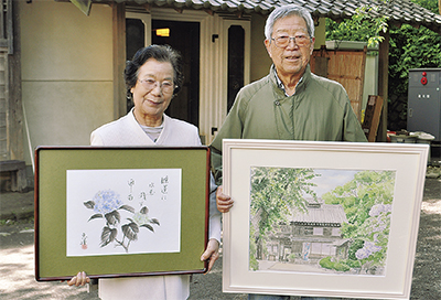 4月に結婚60周年を迎えた阿久和西在住の佐野三郎さん(89)と千恵さん(82)夫婦が、長屋門公園で「二人展」を開いている。水彩画・俳画・鉛筆画など力作およそ45点を展示しており、今年9月に卒寿となる三郎さんは「(創作活動の)集大成と思って開催を決めました。多くの人に見てほしい」と呼びかける。会期は6月9日(土)まで(23日は休館)。
