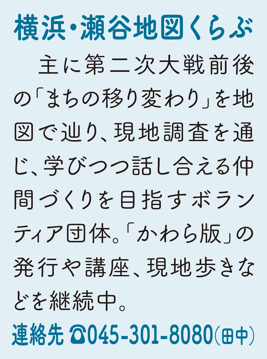 2019年に瀬谷区制50周年を迎えるにあたり、「わがまち」の生い立ちと、第二次大戦前の姿を残しつつ急激に都市化が進んだ「せや」の姿を地図・絵図で辿りながら、次世代に伝えたいとの想いを、この連載を通じて綴ってみたい。