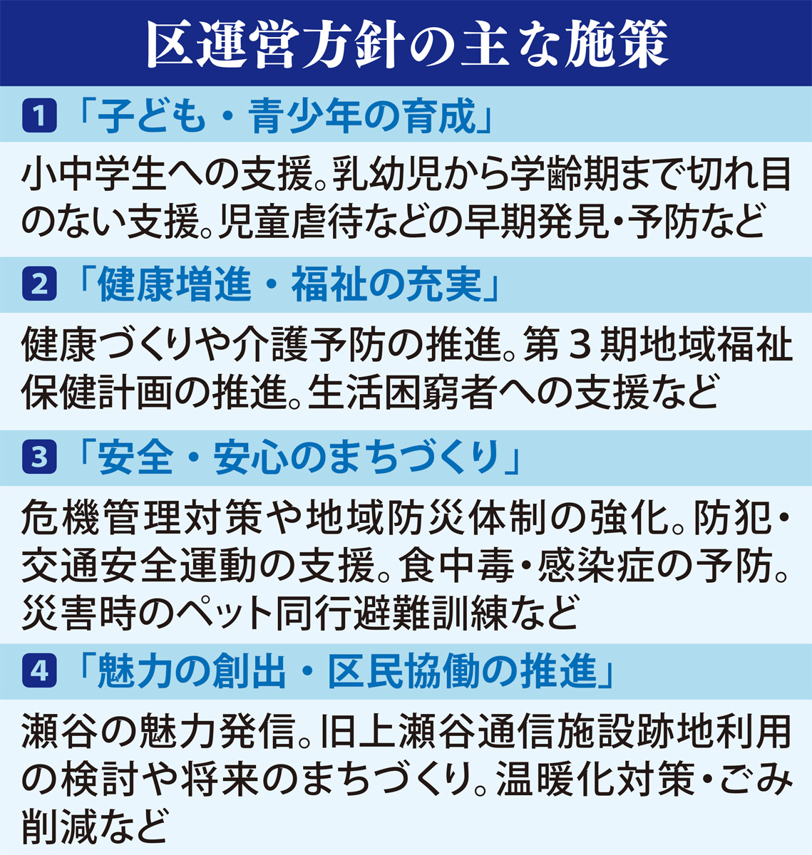そのほかの主な施策は上表。運営方針は瀬谷区ホームページでも公開されている。