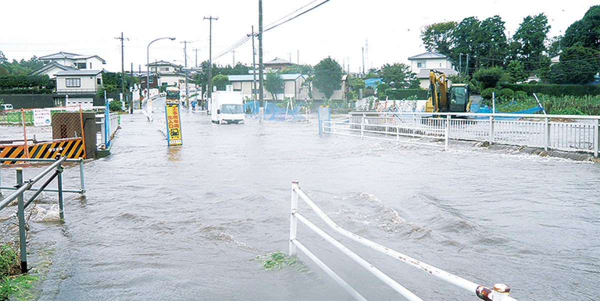 和泉川では、2014年の台風18号による被害が特に甚大だった。新宮西橋(泉区和泉町)でも道路に浸水し、車が通行できなくなるほどの事態となった=写真下。市では改修工事とあわせて、13000㎥の雨水を一時的に滞留させることができる貯留施設を設けるなどの対策をとってきていた。