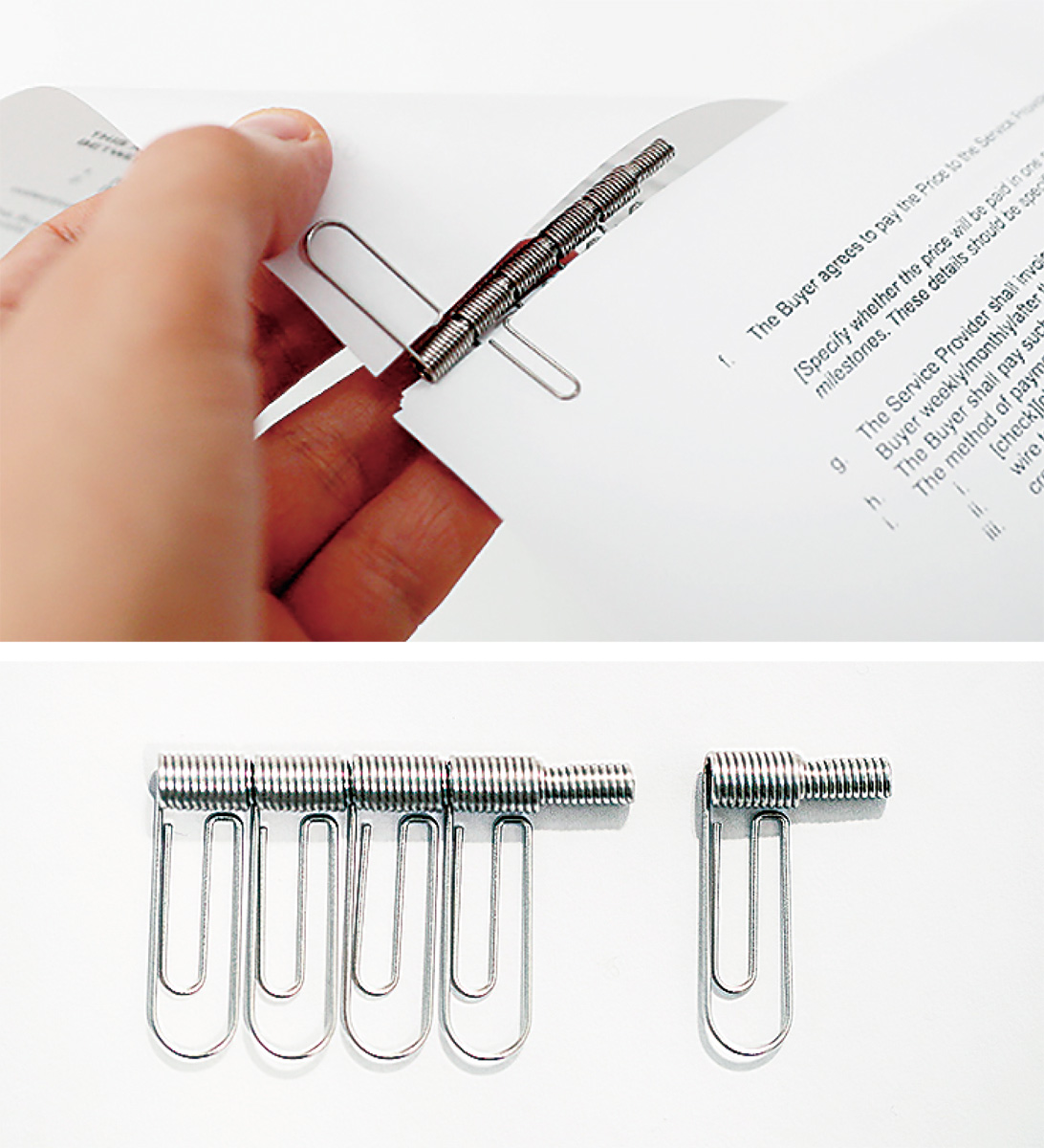 「CLIP」のデザインなど監修は、西村拓紀デザイン(株)(東京都)が担当。昨年11月に完成した。特長は、「書類をいつまでもめくれること」。通常は、まとめた書類をめくると折り跡がついてしまうが、「ねじりばね」や「引きばね」の技術を駆使したこのクリップは、回転することでスムーズにめくり続けることが出来るという。また、特殊なくぼみの形状を採用しており、クリップ同士の付け外しも自由自在。簡単にページ数を増やすことができる仕組みだ。